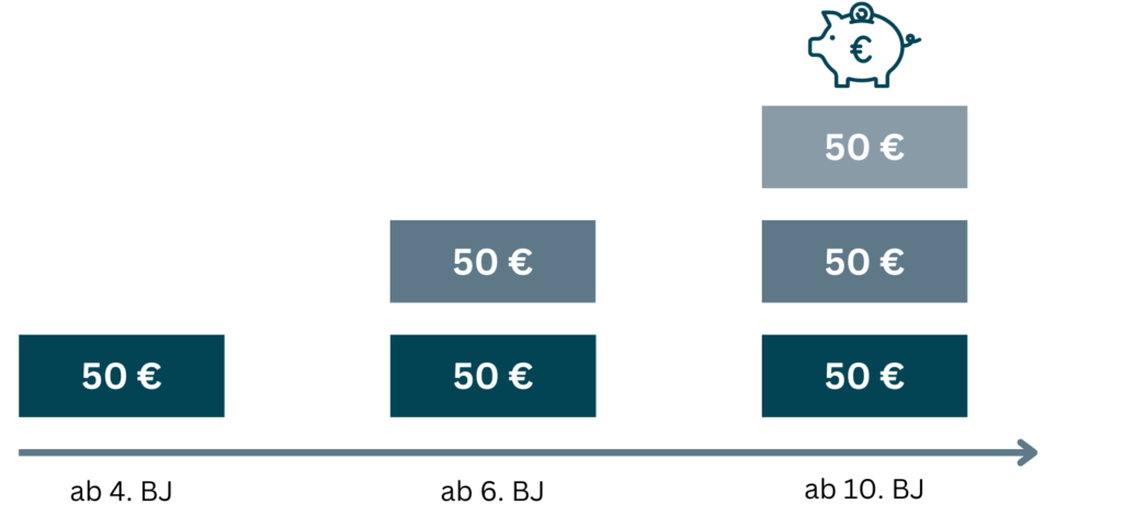 Loyalty that pays off: from the 4th year of employment with us (BJ), we pay into a pension plan for you every month with a lifelong pension. The amount paid in depends on your length of service – the longer you work for us, the higher the amount.
